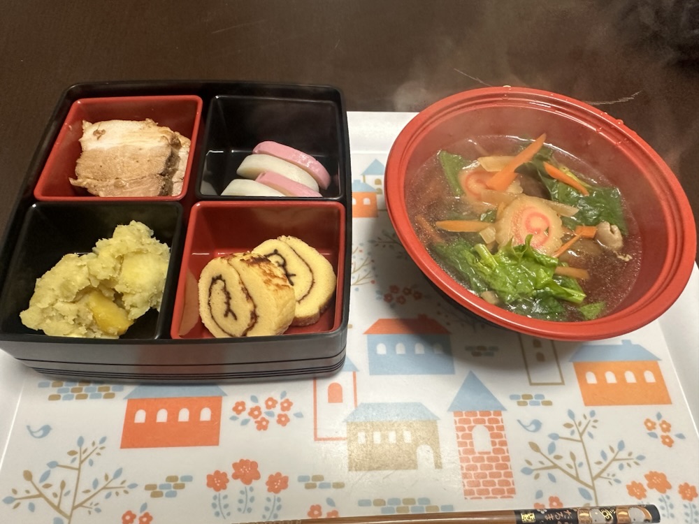 謹賀新年! 2026.01.01 更新 前日からスタッフとおせち料理を仕込み⸜( *´꒳`*)⸝ 伊達巻、栗きんとん、焼き豚、かまぼこ 利用者様が「世界一美味しい!」と言ってくれる管理者お手製のお雑煮! 今年もよろしくお願いいたします! 夜も奮発してお寿司になりました! いつもお疲れ様です! 共有:TwitterFacebook « next prev »